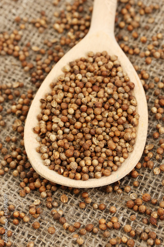 Heap coriander seeds in wooden spoon