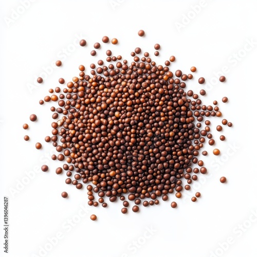 Heap of small brown seeds scattered on a plain white surface top on isoleted white background