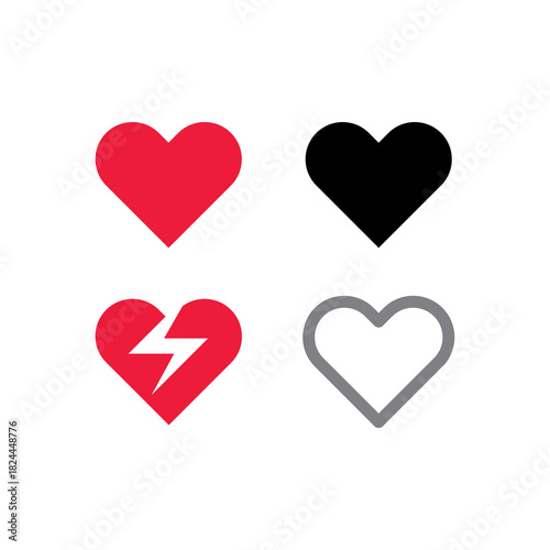 Heart icons set, symbol of love. Red and black heart. Broken heart icon.