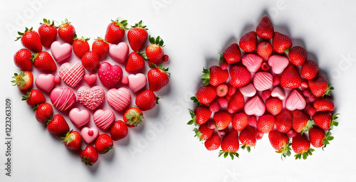 Heart made of strawberries and pralines on a white background