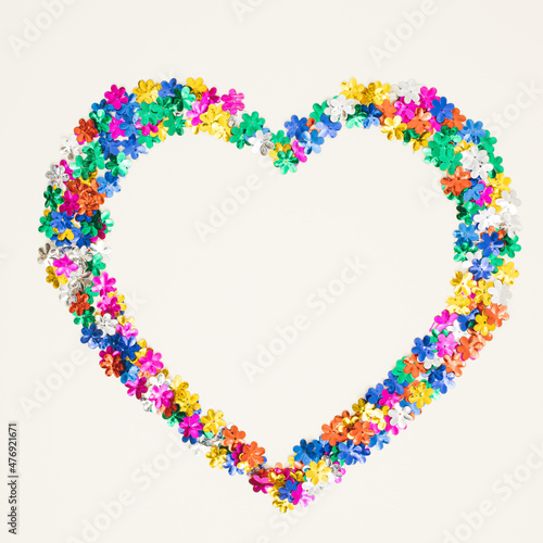 Heart symbol made of flower shaped glitter on white background. Love valentines or woman's day concept. Minimal flat lay.