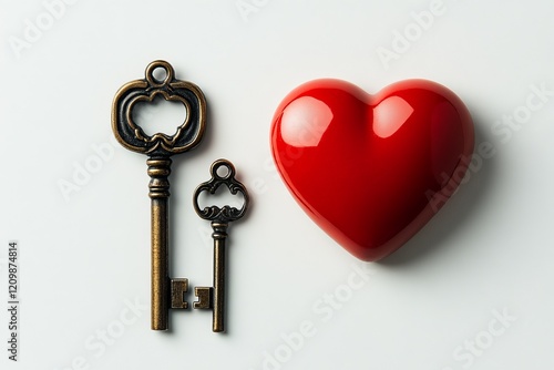 Heart-shaped object and vintage keys symbolize love and mystery in artistic arrangement