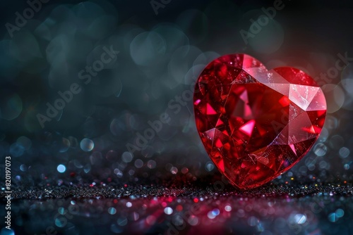 Heart-shaped ruby with sparkling bokeh background - An enchanting heart-shaped ruby glows amid sparkling bokeh effects on a dark background