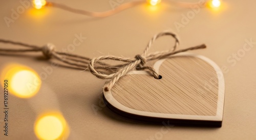 Heartshaped wood tag tied with twine bow soft lighting with bokeh