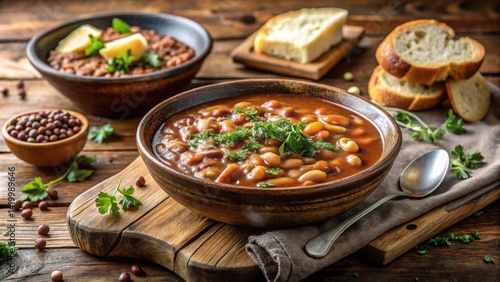 Hearty Bean and Vegetable Stew Served in Rustic Bowl with Crusty Bread