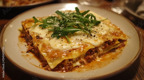 Hearty homemade lasagna with beef bolognese, bechamel, and fresh arugula