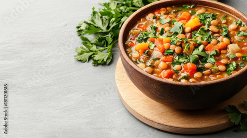 Hearty lentil stew with herbs and vegetables in rustic bowl, warm and nourishing