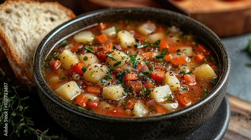 Hearty vegetable soup with carrots, potatoes, celery, and herbs, served in a deep bowl with a slice of crusty bread