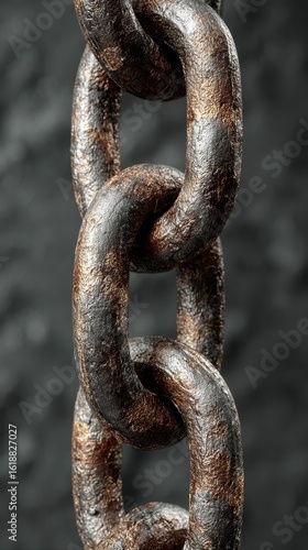 Heavy metal chain links in close-up with detailed texture showing rust and aging against a dark background