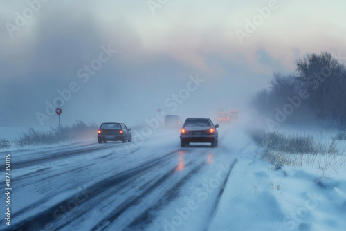 Heavy snowstorm impacts traffic along a rural road in winter. Generative AI