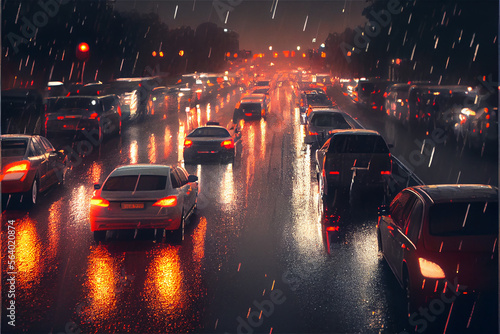 Heavy traffic in a rainy evening in the city, generative AI