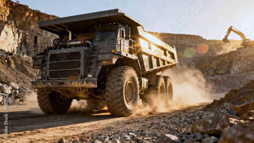 Heavy truck in dusty open pit quarry. Powerful truck moves across dusty open pit quarry, carrying massive loads. Heavy machinery, mineral extraction, truck at work and mining landscape concept