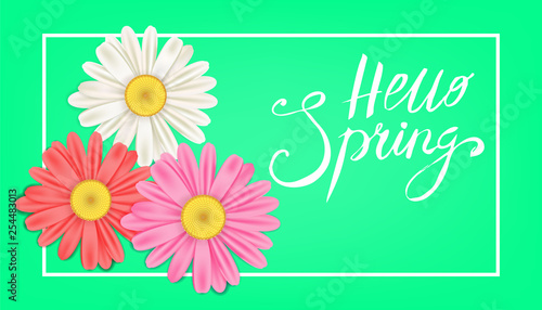 Hello Spring banner. Hand drawn lettering. Background with chamomile, daisy. Spring Time template, flyer, posters, brochure. Happy spring Day. Fashionable styling. Flower vector isolated