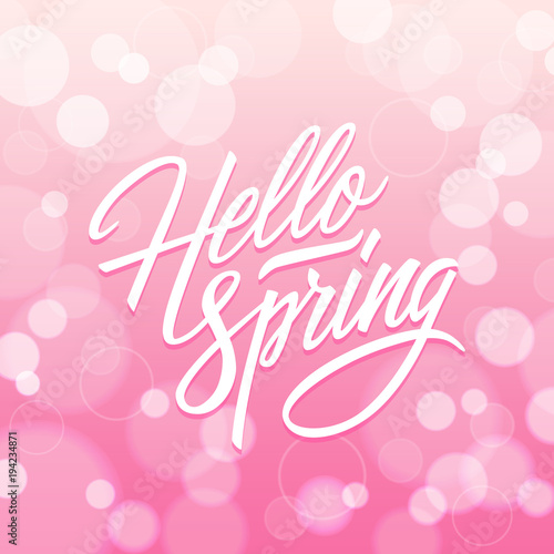 Hello Spring hand drawn lettering on pink bokeh background. Creative typography for your design. Vector illustration.