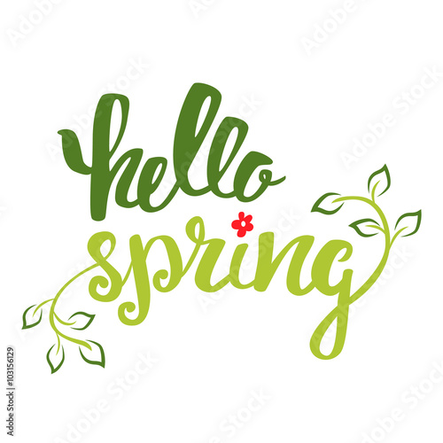 Hello Spring. Hand lettering, calligraphy inscription with spring leaves.