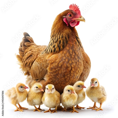 Hen with its chicks isolated on white background