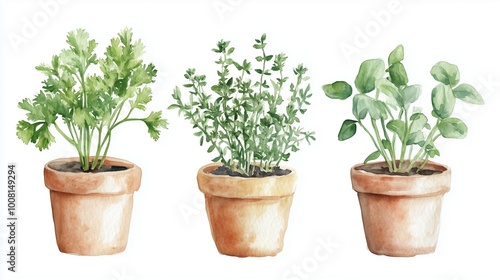 Herbal plants in terracotta pots arranged side by side on a white background showcasing vibrant green leaves in a kitchen setting