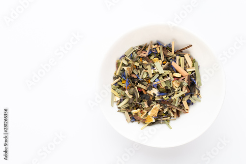 Herbal tea on a white background. Top view.