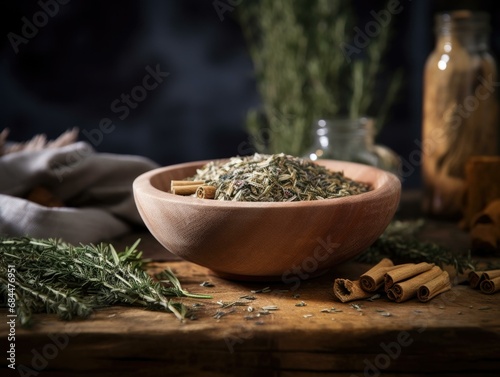 Herbs and spices in a wooden bowl on a table. Generative AI.