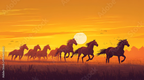 Herd of wild horses running through vast prairies, golden sunset, serene landscape. Vast Prairie. Illustration