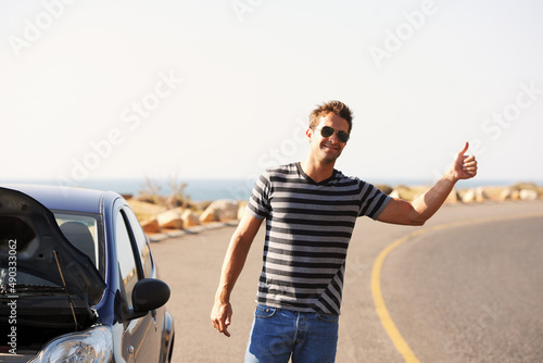 Hes hitching a ride. A handsome young man standing on the side of the road besides his broken-down car and hitching a ride.