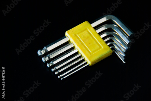 Hex wrench, available in various sizes, in stainless steel pieces, on a black background, at the top corner.