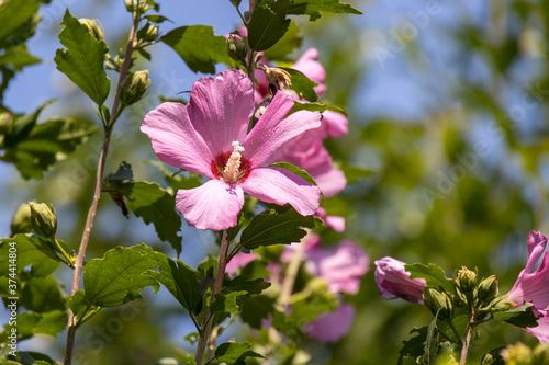 Hibiscus shrub growing and flowering in Torre de' Roveri Italy