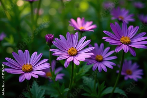 High angle shot of a row of purple daisies with lush greenery, green, high angle