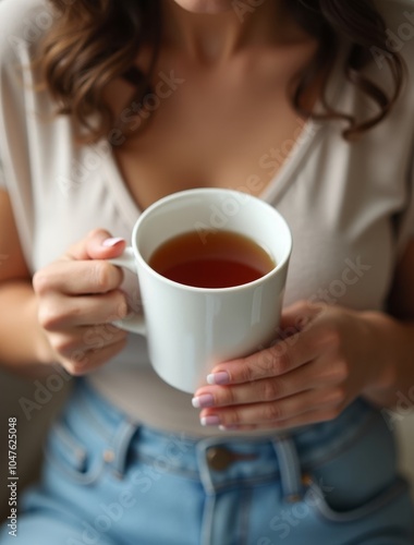 high angle woman holding white mug with tea