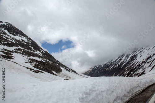 High in the Alps. Snow-capped mountain slopes. Low cloudiness.