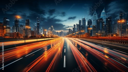 High speed urban traffic on a city highway during evening rush hour, car headlights and busy night transport