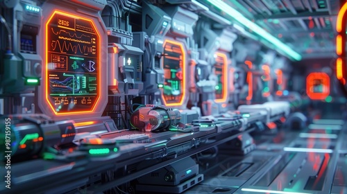 High tech futuristic digital control panel with illuminated cyberpunk style interface showing various data and information displays in a retro industrial interior setting