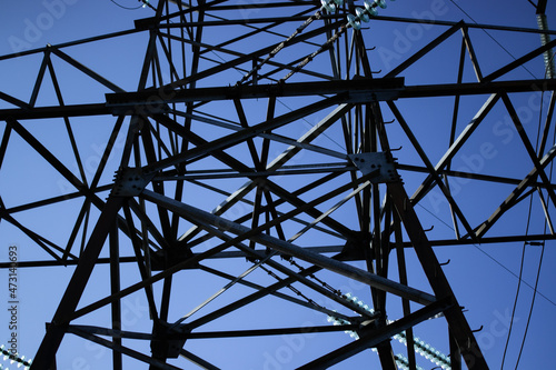High voltage tower with power lines. View from bottom to on the top of tower's voltage