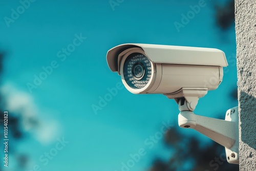 High-definition surveillance camera mounted on a building against a bright blue sky