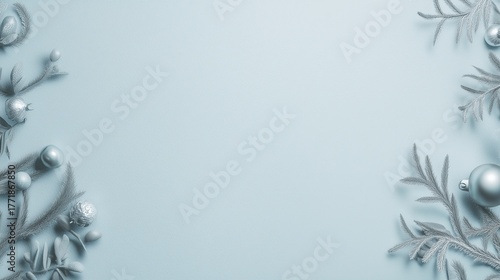 High-End Blue Festive Background with Silver Pine Branches and Baubles for Luxury Branding Design