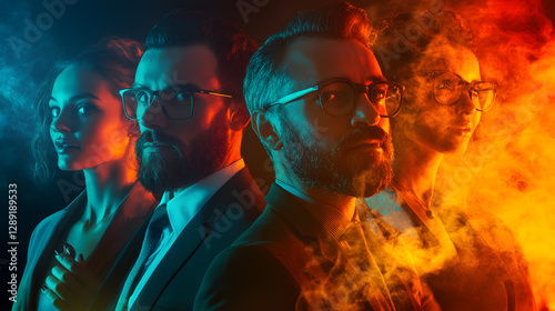 High-energy diversity team discussion portrait with dramatic lighting modern office professional environment dynamic viewpoint
