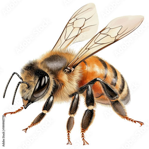 Highly detailed close-up of a honey bee with transparent delicate wings, fuzzy body, black stripes, legs, antennae, and intricate anatomy isolated on white background