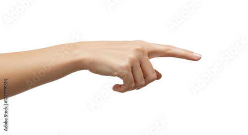 Highly detailed photorealistic female hand, close-up, index finger bent as if indicating, smooth matte skin, flawless white. Isolated on transparent background, png
