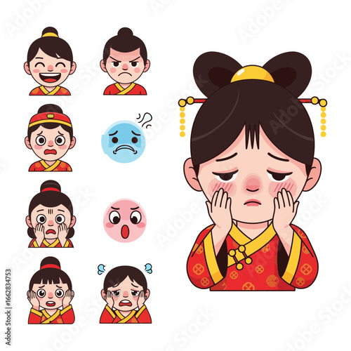 High-quality flat design vector set of Chinese cartoon emoticons with ashamed, happy, sad, angry, and surprised faces. Perfect for microstock and graphic projects.