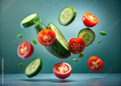 High-quality food photography: cucumber and tomato slices, dramatic bokeh effect.