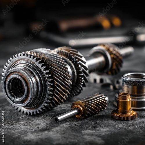 High-quality photo of disassembled car automatic transmission gears in workshop. Engineering, mechanical design, auto part service. Tech machine component concept, mechanical.