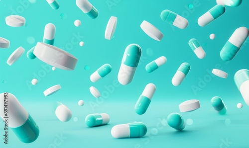 High-Resolution C4D Render of Floating Blue, White, and Green Pills in Minimalist Style with Macro Lens and Soft Light Creating a Calming Atmosphere
