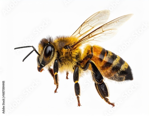 High-resolution image of a honey bee with detailed focus on wings and body, isolated on a white background.
