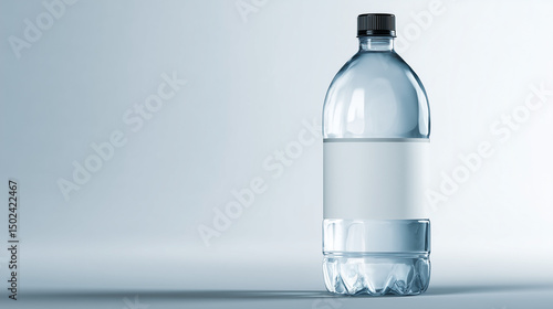 high-resolution photo of a 1.5-litre clear plastic mineral water bottle standing upright with a blank white label.