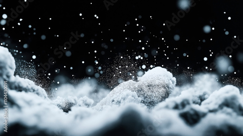 High-speed macro photograph of white powder particles in motion against a dark background, capturing dynamic movement and texture in floating clouds and scattered specks.