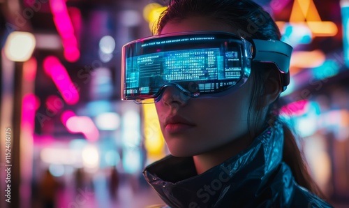 High-tech augmented reality glasses displaying a dynamic interface, worn by a person standing in a neon-lit urban environment.