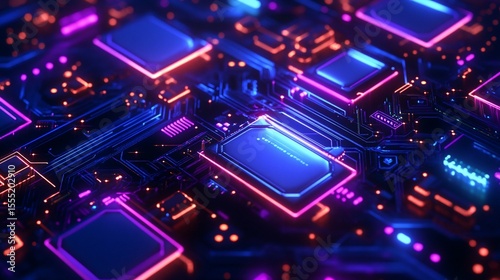 High-tech circuit board with neon glow. Complex intricate electronic components