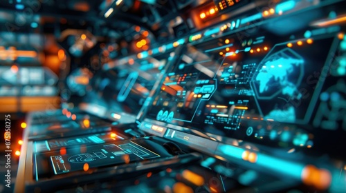 High-tech control room with futuristic digital screens displaying data and world maps, illustrating advanced technology and innovation.