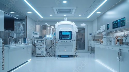 Hightech hospital room with a dialysis machine tubes connecting to the patient sterile medical devices and medications organized for kidney treatment