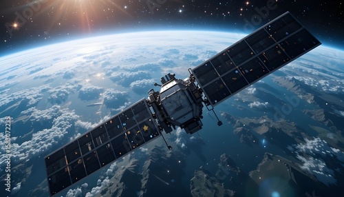 Hight-Tech Artificial Satellite Orbiting Earth.Twinkling Stars.